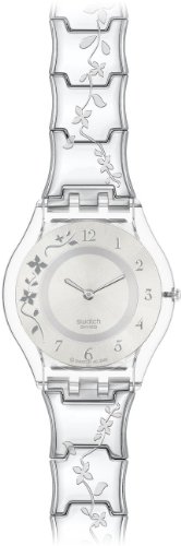 Transparent plastic case with a stainless steel bracelet with embossed flower motifs. Fixed bezel. Silver dial with silver flower motif. Quartz movement. Shock proof. Scratch resistant mineral crystal. Skeletal case back. Case diameter: 31.4 mm. Case thickness: 3.9 mm. Jewelry clasp. Water resistant to 20 meters (65 feet). Swatch Skin Classic Climber Flowery Ladies Watch SFK300G RelateItems- Swatch Women's LK307G Quartz Stainless Steel Silver Dial Watch