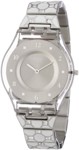 Swatch SFK356G Skin women's watch features a 34mm wide and 8mm thick transparent plastic case with push and pull crown. Swatch SFK356G is powered by an accurate Swiss quartz movement. This beautiful watch also features a shiny silver dial with silver tone hands and hour markers, scratch resistant mineral crystal and water resistant to 30 meters. Swatch SFK356G is equipped with a 16mm wide beautiful stainless steel bracelet with Jewelry clasp. Swatch SFK356G Women's Skin Swiss made silver dial stainless steel watch is brand new and comes in an original Swatch gift box and is backed by a 2 year manufacturer warranty.